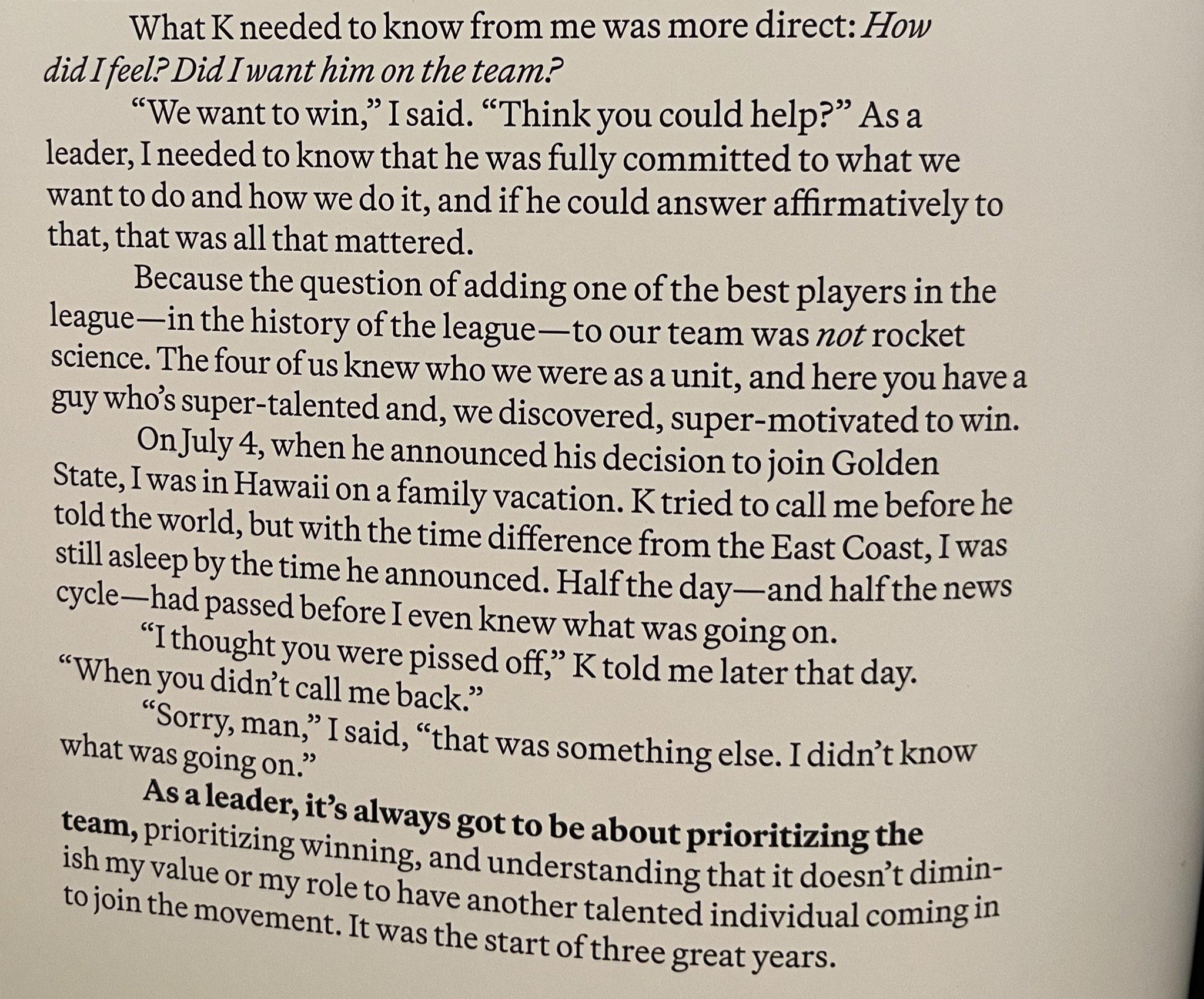 库里在书中写道:“7月4日,当他宣布决定加入金州时,我正在夏威夷与家人度假。杜兰特试图在告诉全世界之前给我打电话,但由于东海岸的时差,我在他宣布时还在睡觉。半天过去了,我才知道发生了什么。”